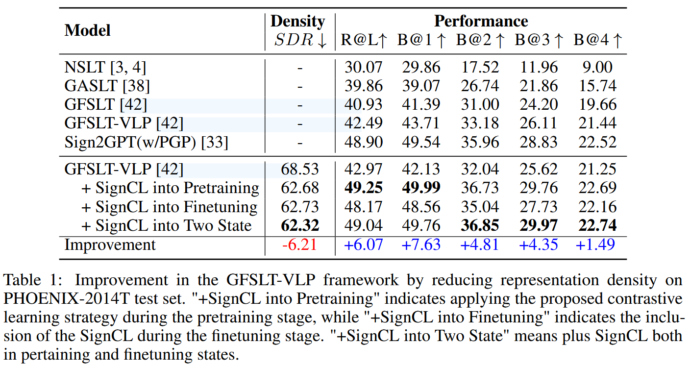 为了解决表示密度问题,我们引入了一种简单但有效的对比学习策略,即SignCL,它鼓励gloss-free模型以自监督的方式学习更具判别性的特征表示。
