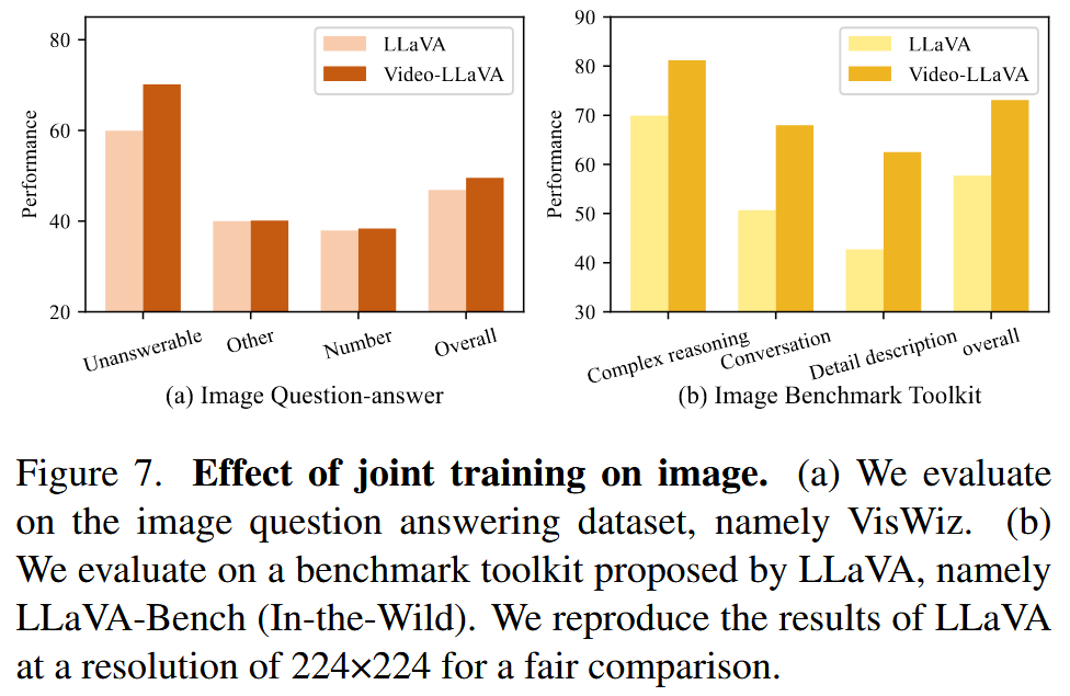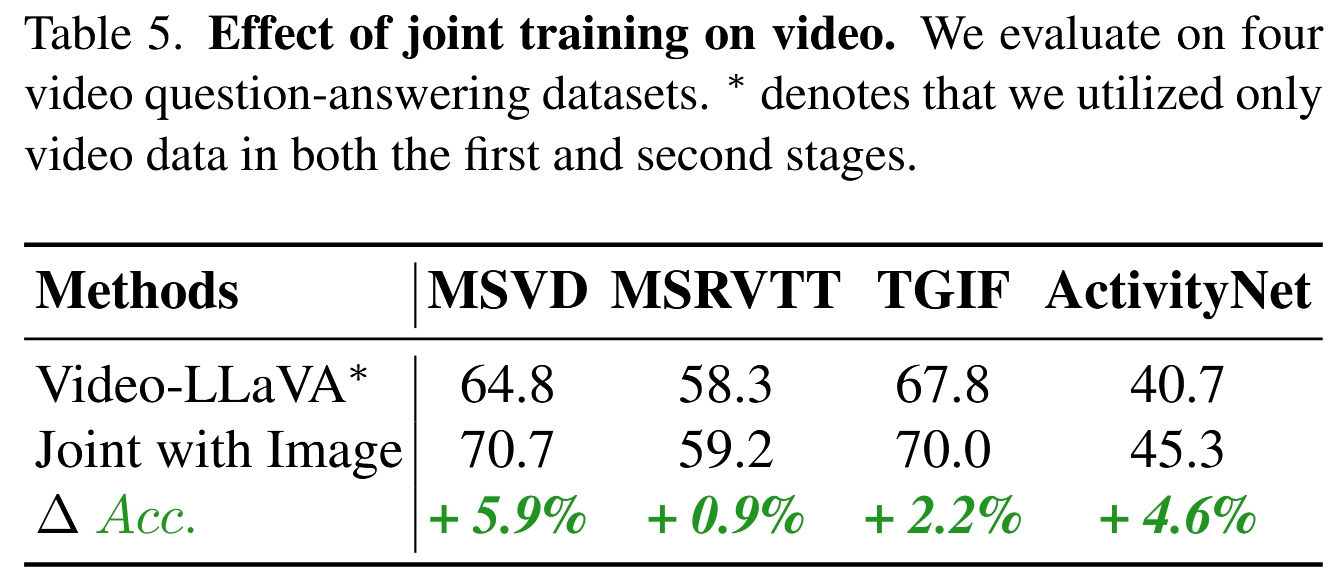 这些结果共同证明了Video-LLaVA训练框架的有效性。