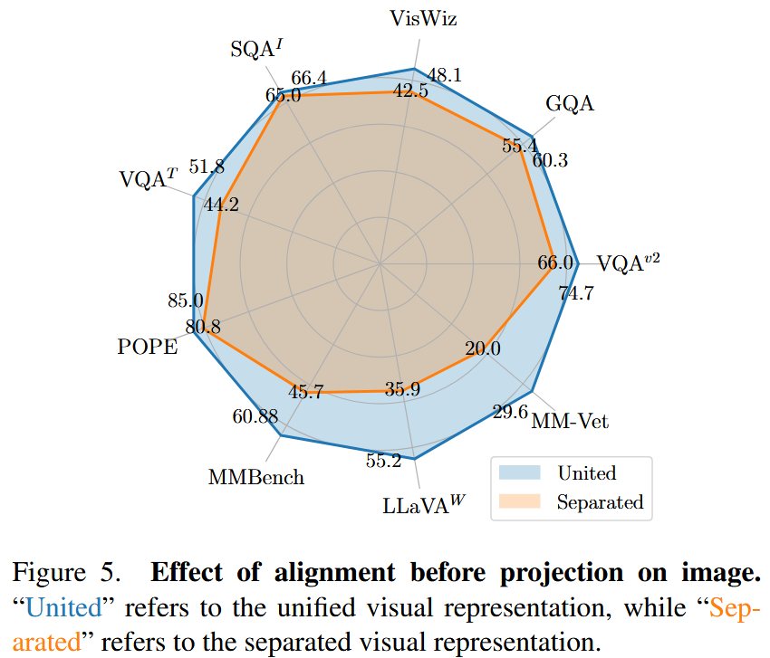 此外,我们验证了在投影前对齐视觉表示有助于大语言模型的学习。