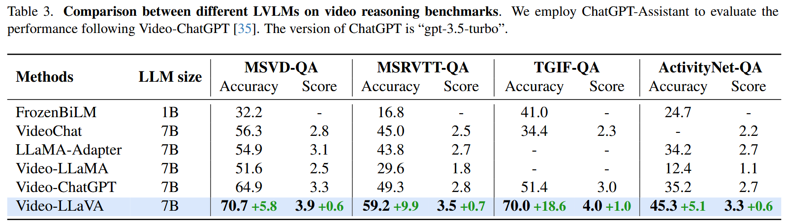 此外,我们的Video-LLaVA在MSRVTT、MSVD、TGIF和ActivityNet上分别比Video-ChatGPT高出5.8%、9.9%、18.6%和10.1%。