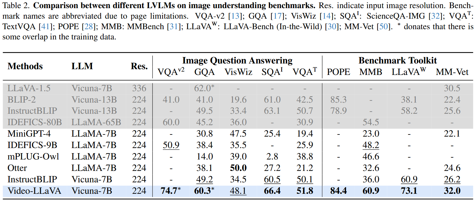 Video-LLaVA在5个图像问答数据集和4个图像基准工具包的9个图像基准上实现了优异的性能。